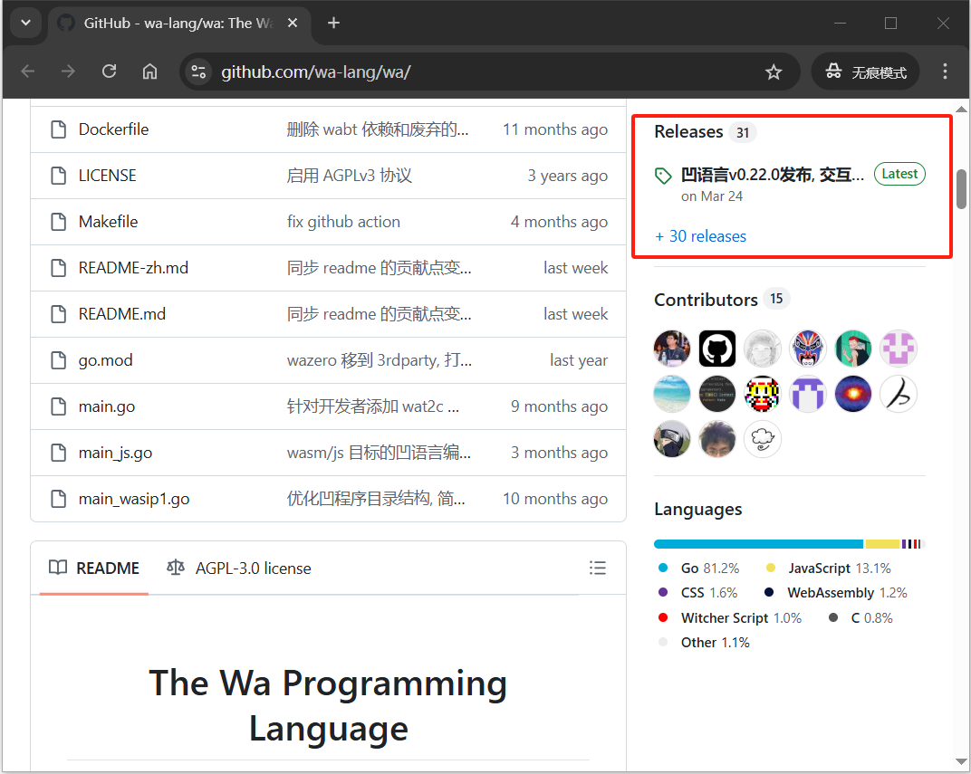 打开凹语言在 Github 的镜像仓库,在仓库主页面右侧栏找到最新的发布版本: