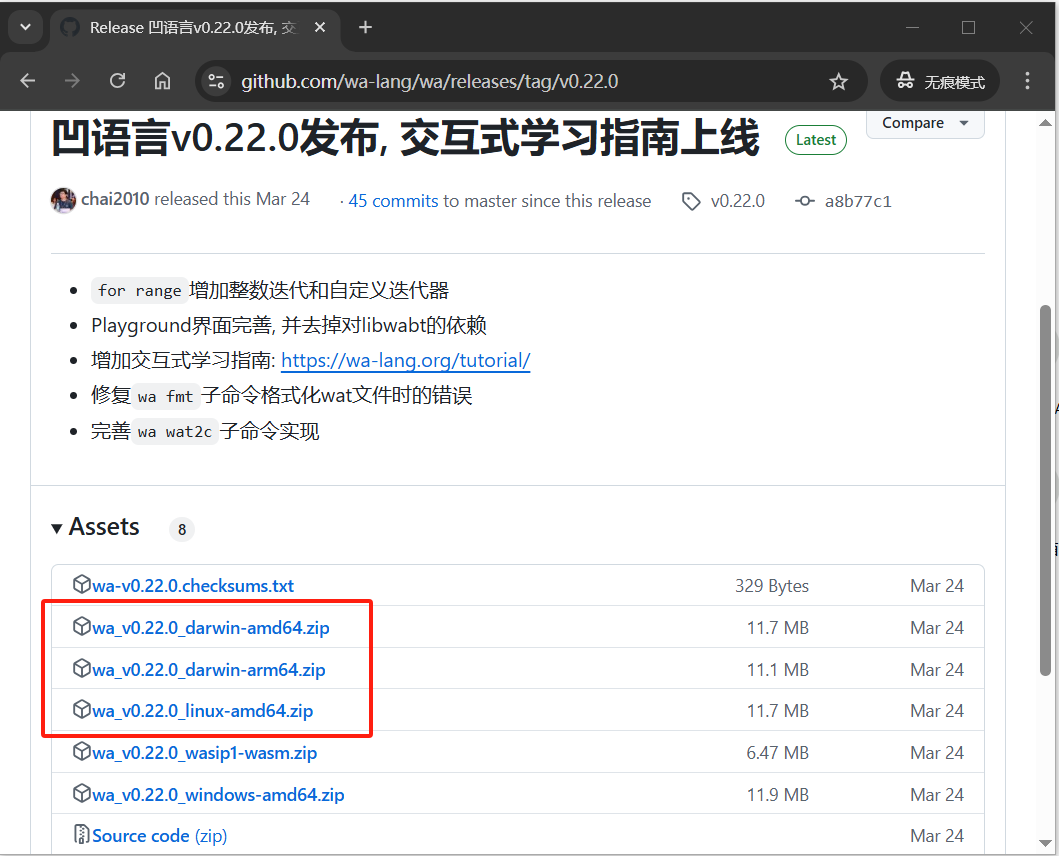 根据当前的操作系统选择对应的二进制文件下载。比如 v0.22.0 对应 Windows/amd64 平台下载的是 wa_v0.22.0_windows-amd64.zip。